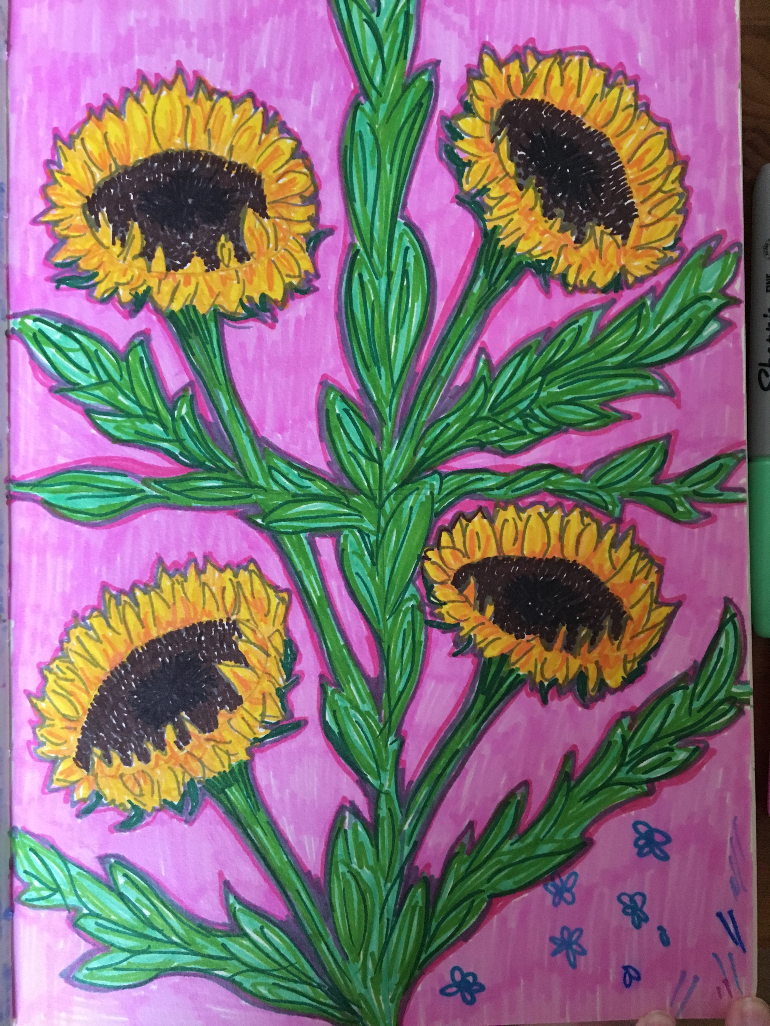 I’d put the flowers in a vase on my kitchen table and initially draw them with sharpies, which felt more like painting. As a personal project I wanted to break out of a creative rut and take the pressure off by giving to a more immediate, less pressured and more intuitive style of drawing – albeit a bit naive.