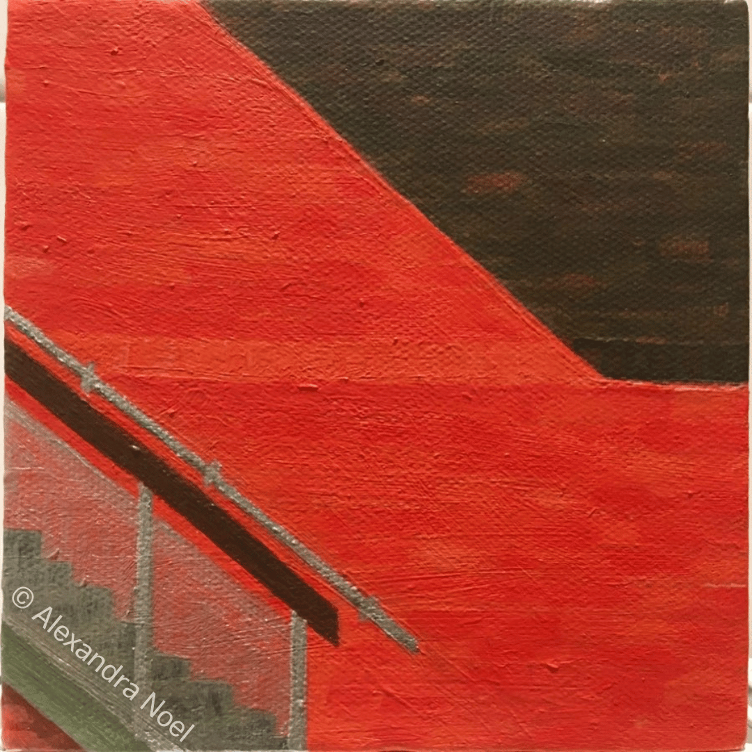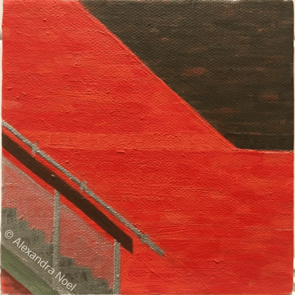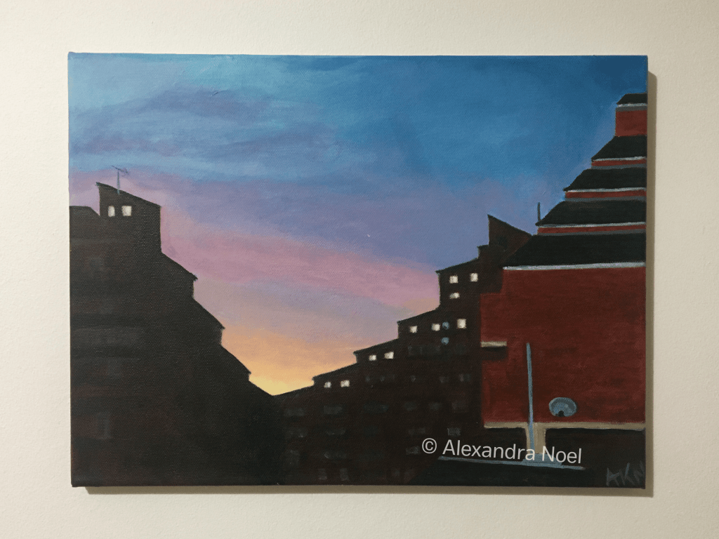 I did this as a personal project to convey that feeling, and I chose a graphic painting style using acrylics to reflect the angular shapes and blocking colours of the Estate. I called the painting ‘Hope in the Mountains’, see below.